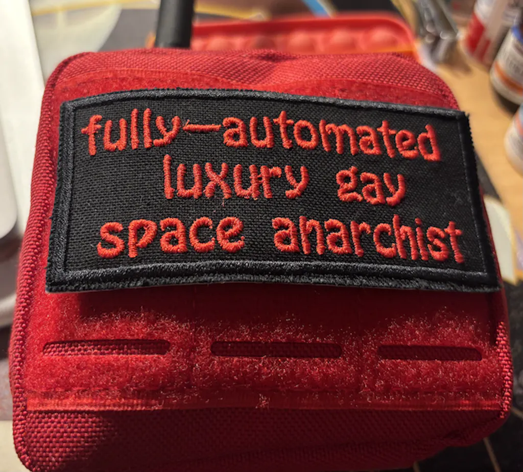 One of my besties loved my Fully Automated Luxury Gay Space Commu Communist patch, but commented that she is really more of an Anarchist. So obviously I reached out to the NK team to see of I could get that made. And here it is! When I gifted it she was so excited and kept coming over to tell me how much she loves it. It's already stitched on her bag! Once again a fantastic piece and why my go to for patches is NK.